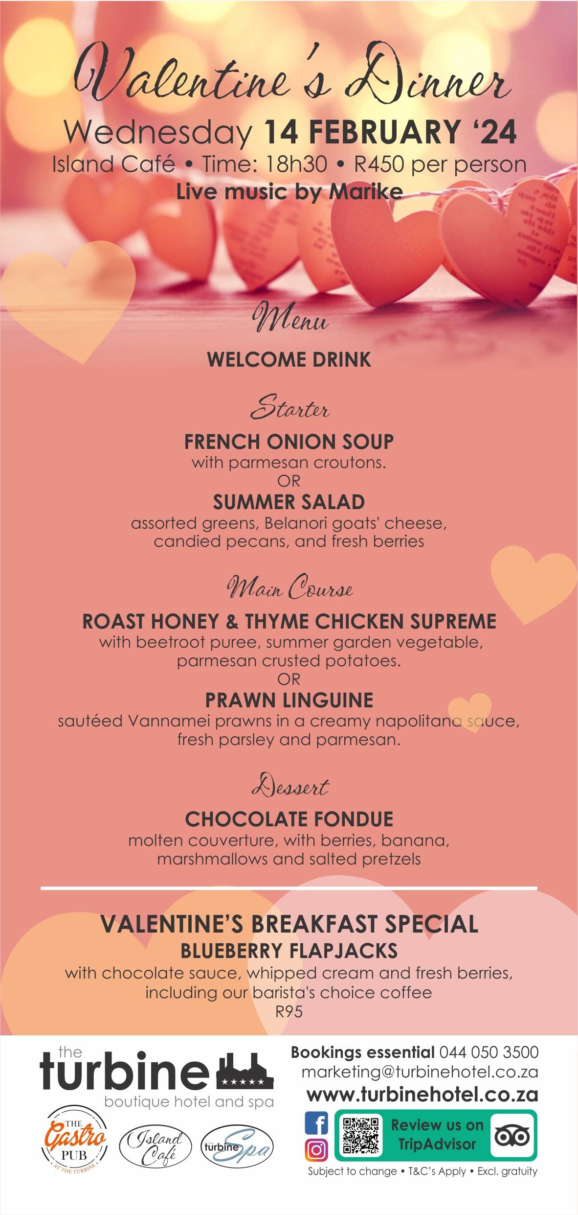 The Island Café invites you and your beloved to a meticulously prepared sit-down dinner accompanied by the soulful melodies of Marike, promising an evening filled with love and enchantment.