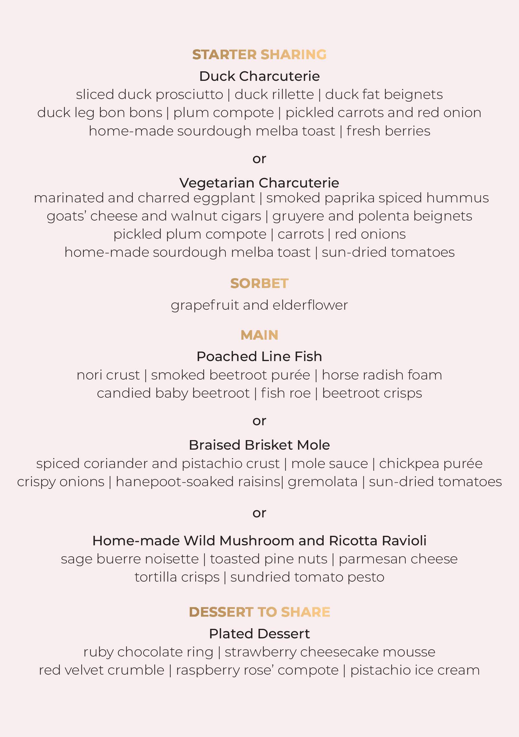 Choose from a starter sharing platter featuring Duck Charcuterie or the Vegetarian Charcuterie for a delightful beginning. Followed by a refreshing grapefruit and elderflower sorbet, prepare your taste buds for the main course. Options include the Poached Line Fish with nori crust or the rich and flavorful Braised Brisket Mole. For a vegetarian option, savor the Home-made Wild Mushroom and Ricotta Ravioli. End the evening on a sweet note with a shared plated dessert that includes a ruby chocolate ring, strawberry cheesecake mousse, red velvet crumble, raspberry rose compote, and pistachio ice cream.