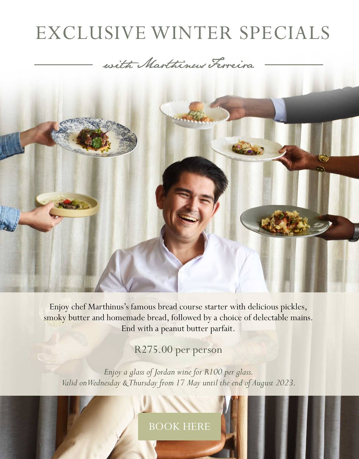 These exclusive winter specials are available on Wednesdays and Thursdays, starting from 17 May and continuing until the end of August 2023. Don’t miss your chance to experience the culinary mastery of Chef Marthinus Ferreira in the breathtaking setting of Jordan Wine Estate.
