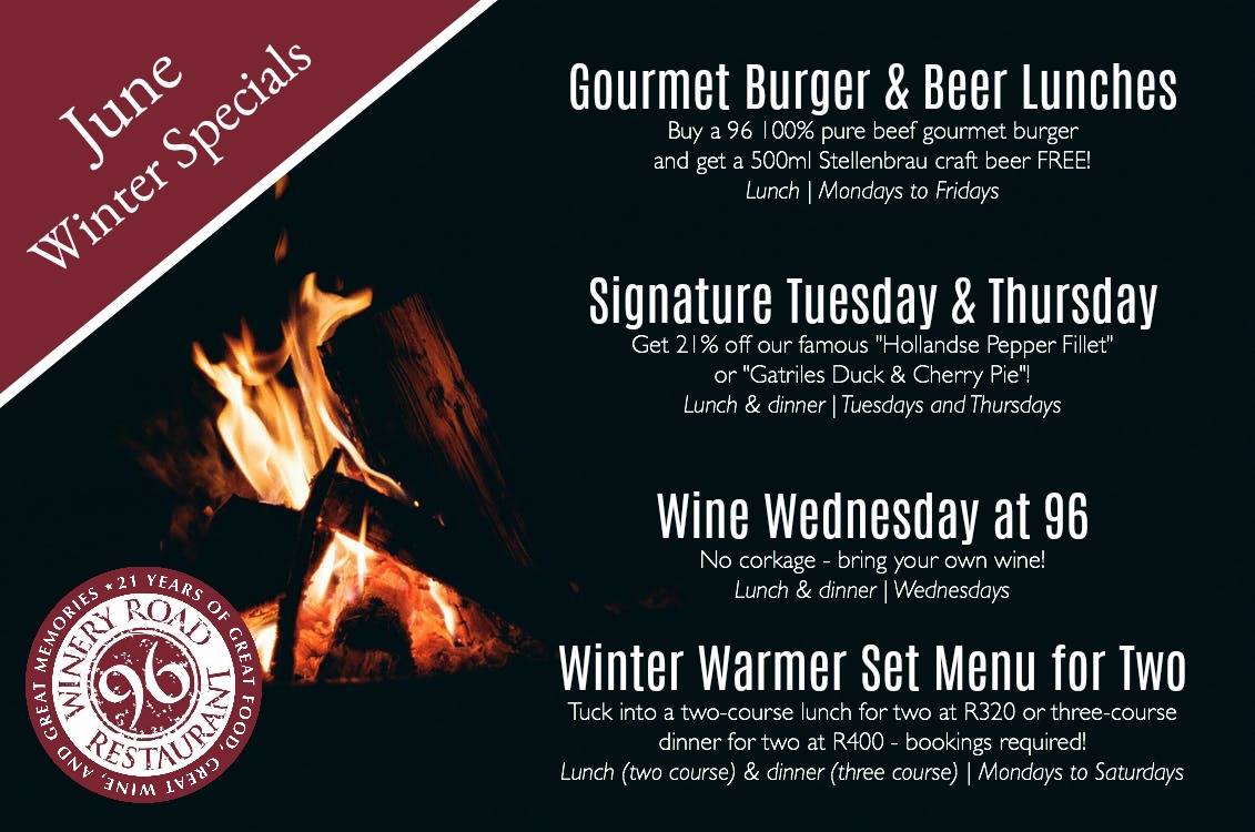 96 Winery Road Restaurant started in May 1996 and it has always been the goal to delight each guest with a superb dining experience in the warm, relaxing venue set in the heart of the glorious Helderberg countryside.
