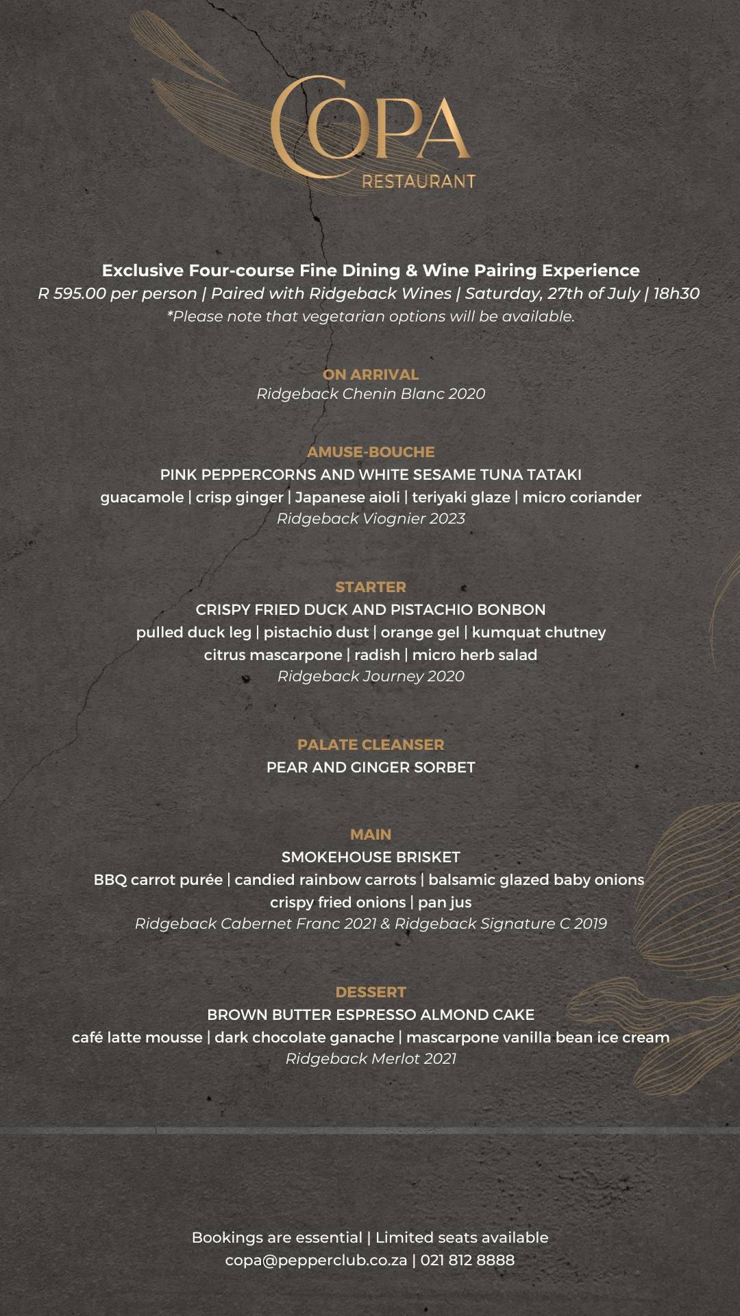 - Start your evening with a Ridgeback Chenin Blanc 2020, followed by an array of delightful courses including tuna tataki, a crispy duck bonbon, smokehouse brisket, and a decadent brown butter espresso almond cake, each paired with a selection of Ridgeback’s finest wines.