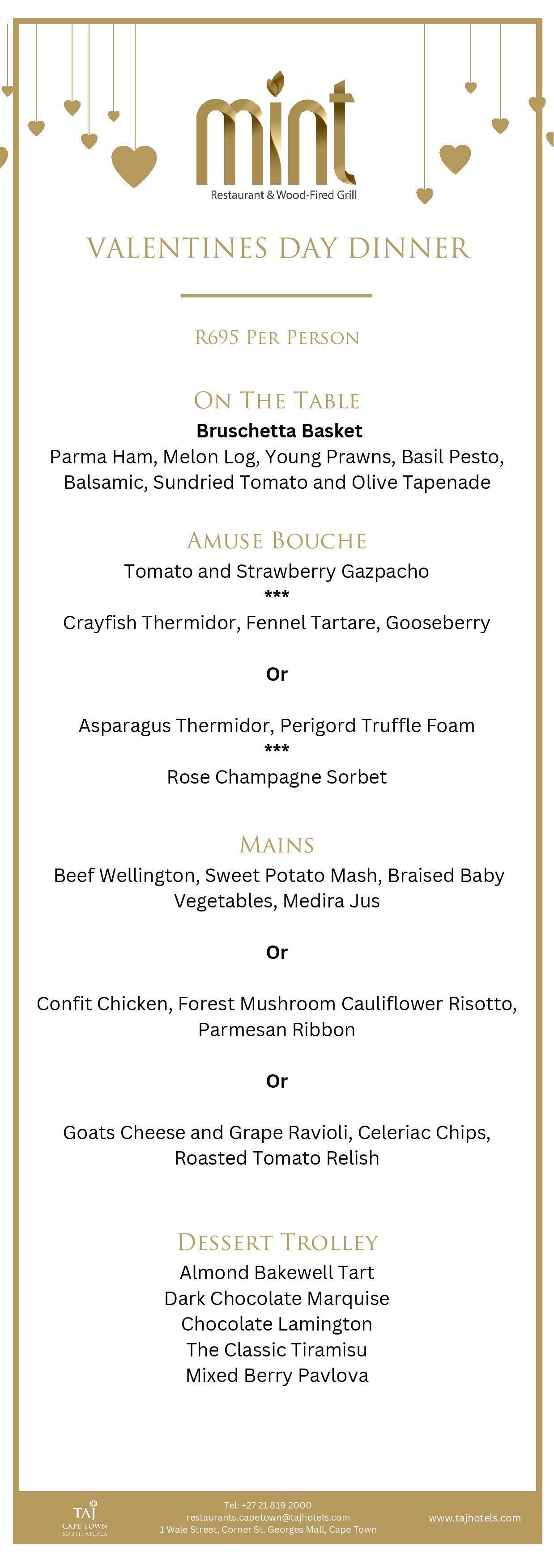 - The carefully curated Valentine’s Day Dinner Menu at Mint features a Bruschetta Basket, tantalizing Tomato and Strawberry Gazpacho, and the culinary masterpiece, Beef Wellington. To culminate the evening on a sweet note, the Dessert Trolley promises an array of delectable treats.