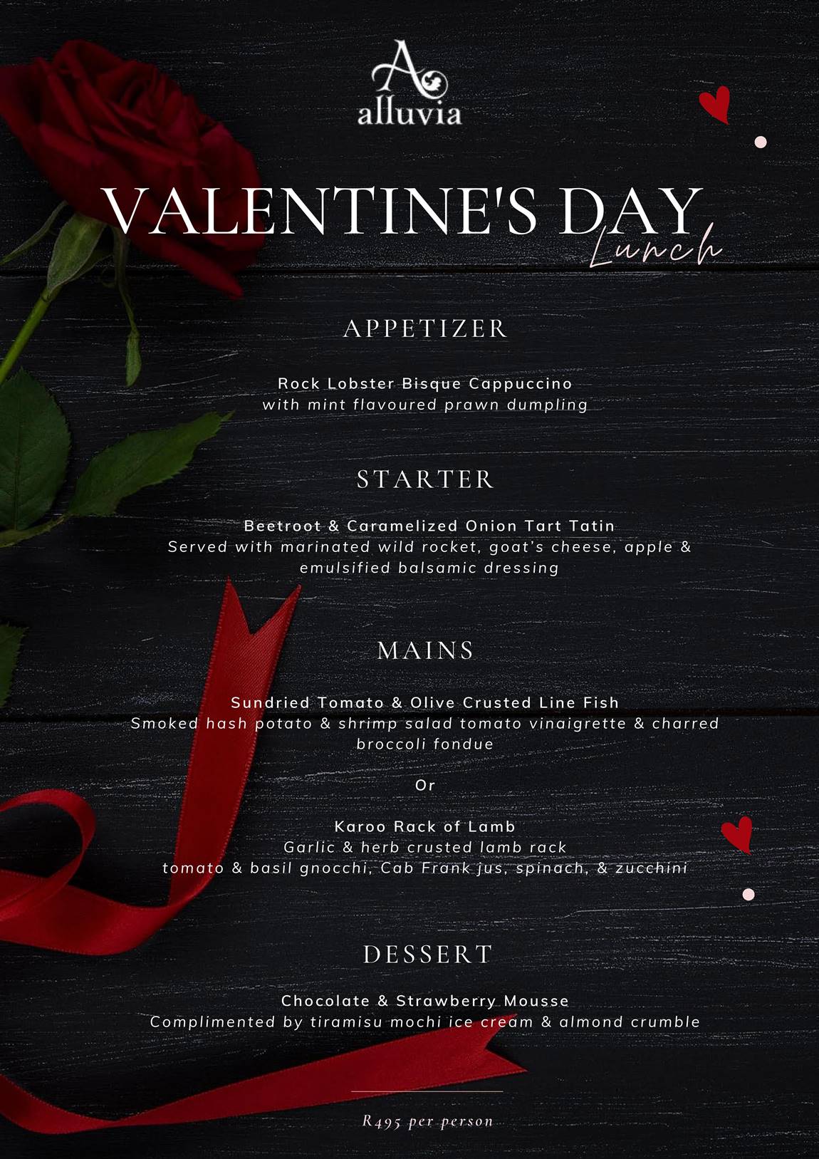 Think caramelised onion tart tatin, Karoo rack of lamb and delicious chocolate and strawberry mousse…it doesn’t get more romantic than this.