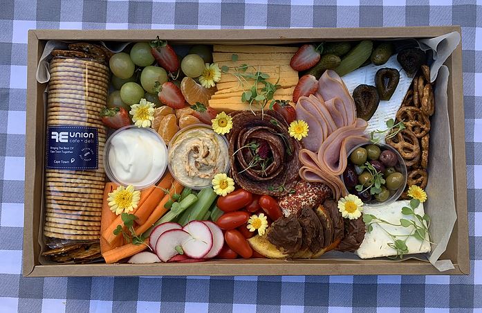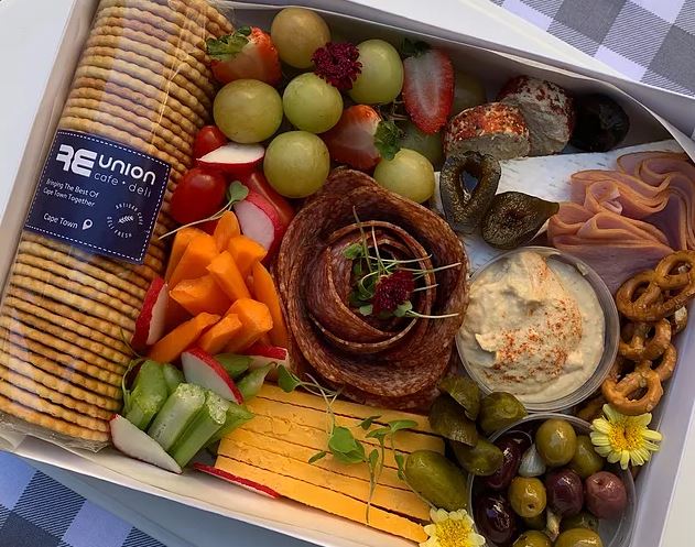 The standard box features an assortment of raw fruit and veg and dips. They added marinated olives, pickles and roasted garlic. They pair it with 3 local cheeses and 2 sliced cold meats. All this is complimented with seasoned crackers and scattered snacks.