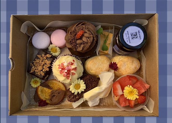 A selection of cupcakes, scones with butter & out iconic berry preserve, cheese, fruit cup, macarons, chocolate brownie.