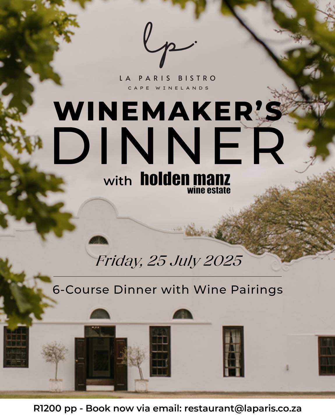 On 25 July 2025, La Paris Bistro in Franschhoek is serving up exactly that: a 6-course Winemaker’s Dinner in collaboration with Holden Manz Wine Estate that promises to delight your palate and spark your curiosity.