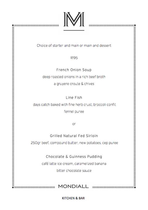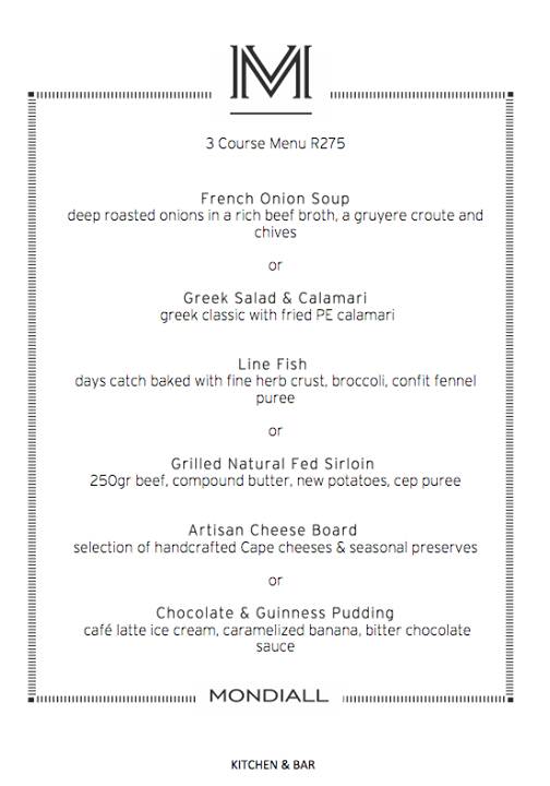 P.S.: Mondiall also offers a 3 course menu (R275) and 2 course menu (R195) .