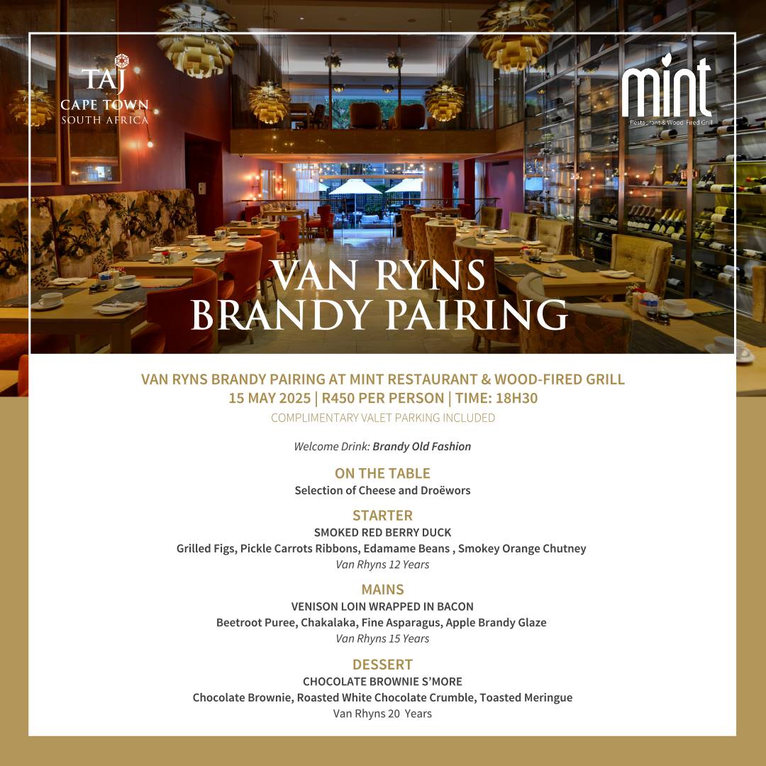 On 15 May 2025, the elegant Mint Restaurant & Wood-Fired Grill at Taj Cape Town is hosting a one-night-only Van Ryns Brandy Pairing Dinner — and it’s going to be all kinds of delicious.