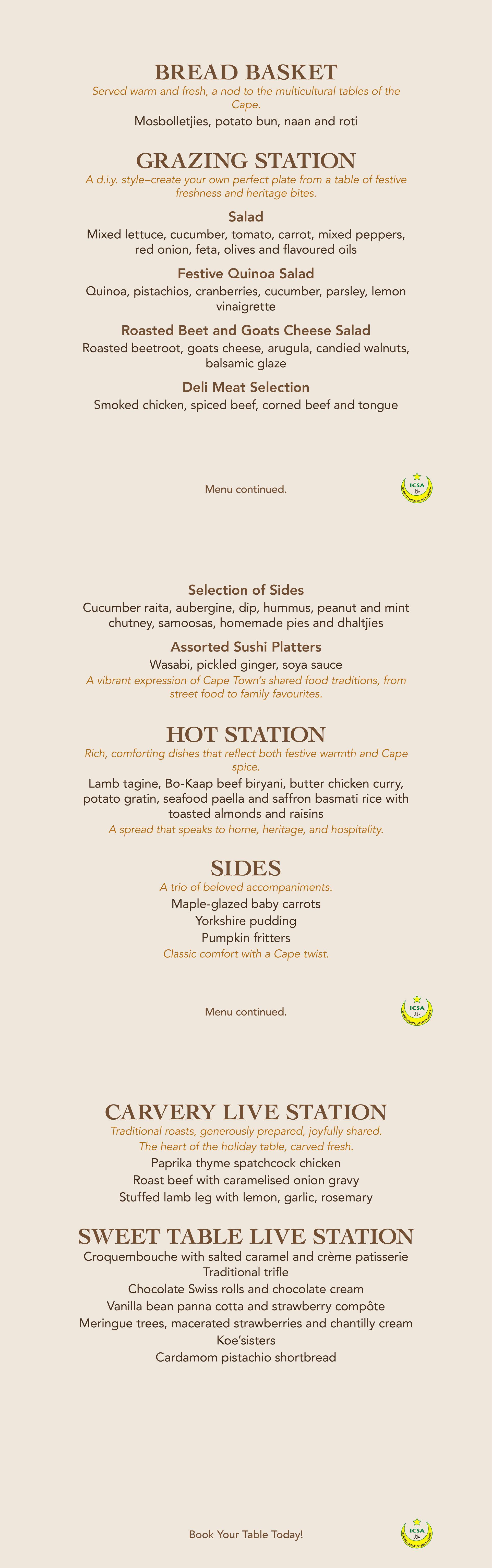 Think carving stations, Cape-inspired curries, festive roasts, sweet treats piled high, and a grazing station that would make even Santa cancel his next stop.