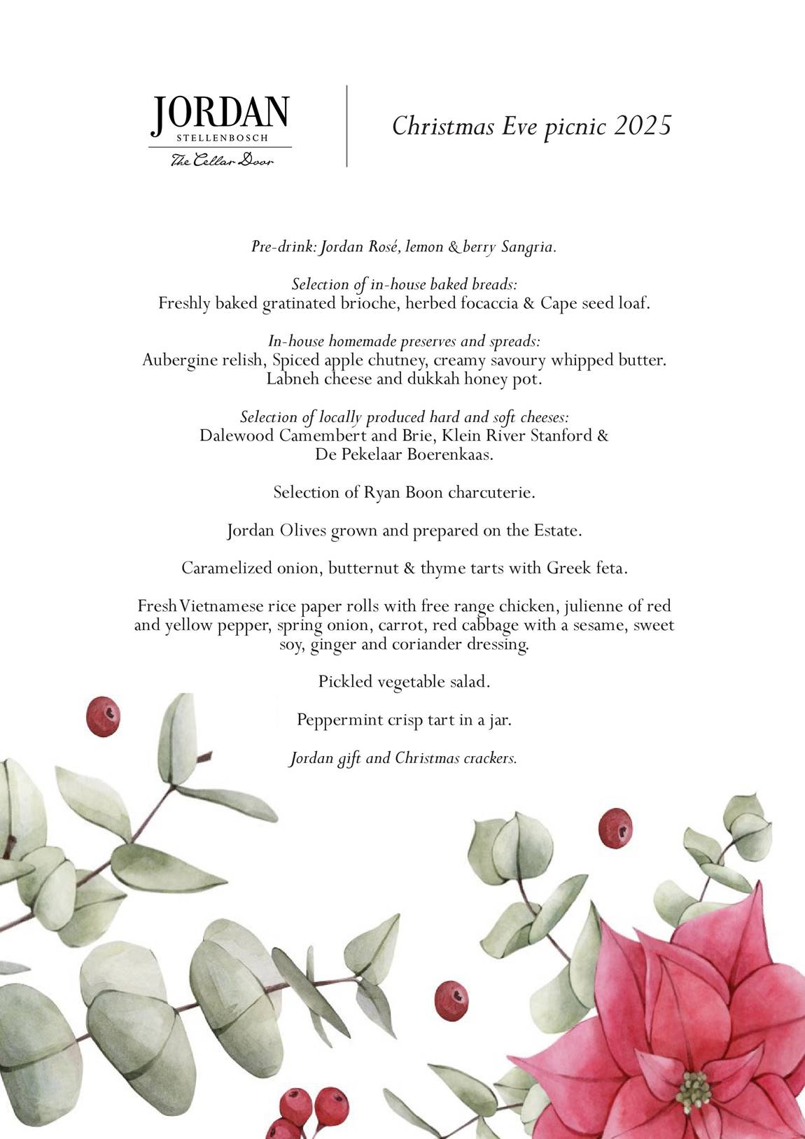 This Christmas Eve, Jordan Wine Estate invites you to ditch the traditional table setting and embrace the laid-back luxury of a harvest-style picnic dinner on The Cellar Door deck — complete with breathtaking views of the dam and mountains, gourmet fare, and that unmistakable festive feeling.