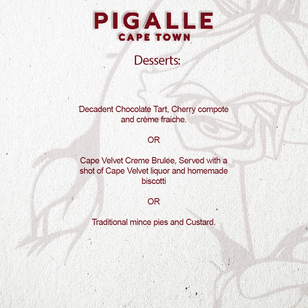 - Then comes dessert — a moment Pigalle takes very seriously. Guests can choose between a decadent chocolate tart, a smooth Cape Velvet crème brûlée served with homemade biscotti, or good old-fashioned mince pies with custard. It’s the kind of sweet ending that wraps the afternoon in a bow.