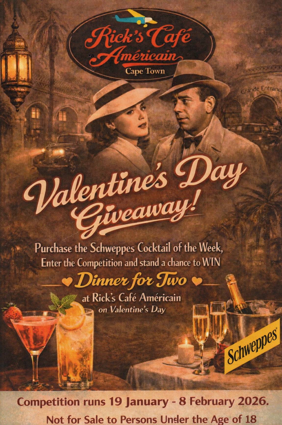 From 19 January to 8 February 2026, guests are invited to purchase the Italian Sunset, the featured Schweppes Cocktail of the Week, and stand a chance to win a dinner for two at Rick’s Café Américain on Valentine’s Day.