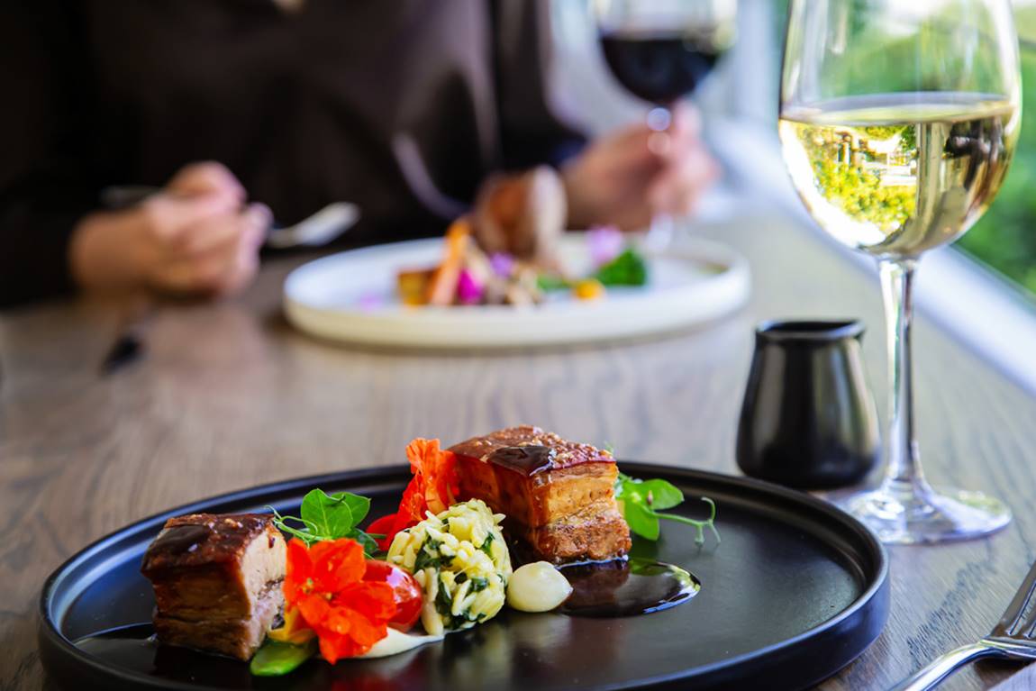 • Pork Belly – Honey & harissa glazed pork belly, Granny Smith apple with muscadel, parsnip, creamy spinach orzo, confit tomatoes, and sugar snap peas. Paired with La Petite Ferme Barrel Fermented Chardonnay.