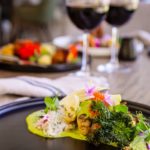 • Cape Malay Pan-Fried Seabass – Herb lemon beurre blanc, yuzu pearls, caper sour cream, crispy kale, charred onion, pickled fennel, and baby turnip. Paired with La Petite Ferme Viognier.