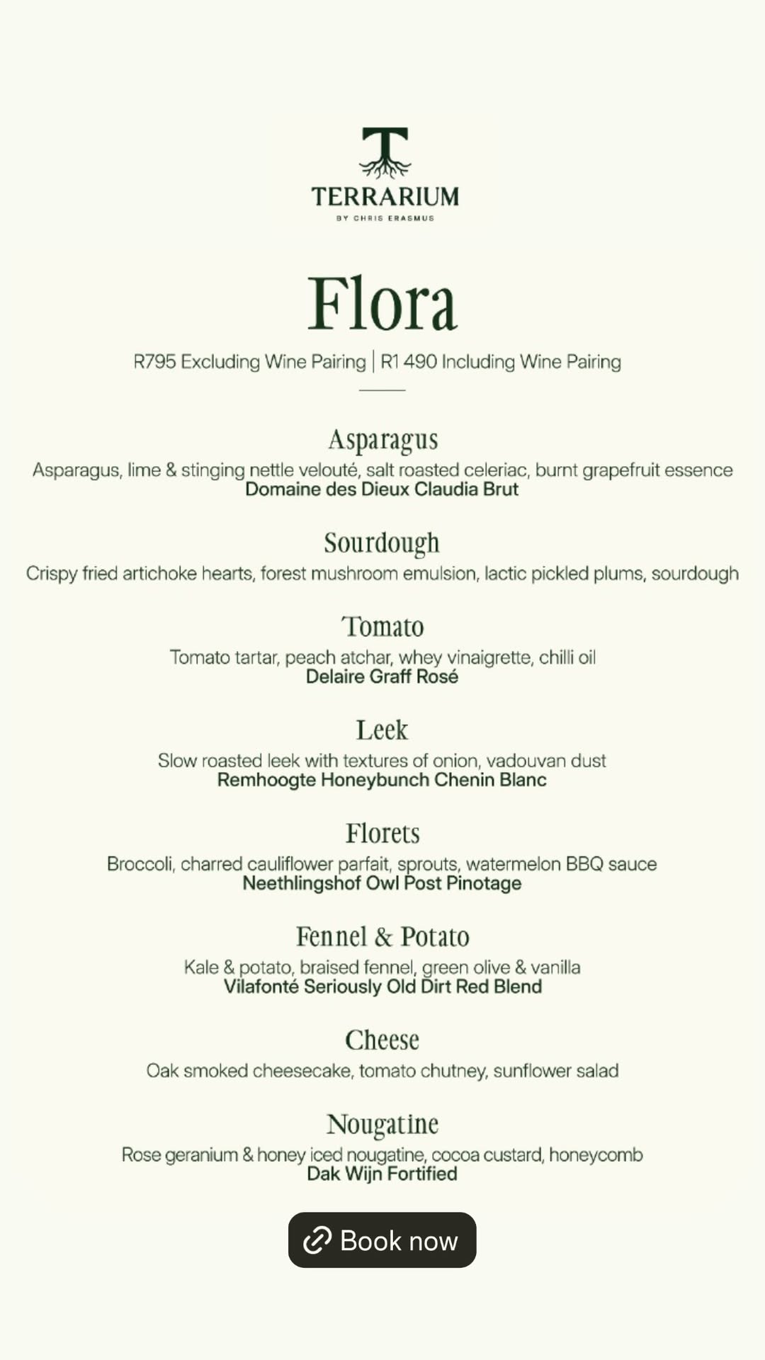 - The Flora menu, priced at R795 excluding wine pairing or R1,490 with wine pairing, is a plant-forward feast. Dishes include the earthy Asparagus with a stinging nettle velouté and burnt grapefruit essence, and the umami-packed Sourdough served with fried artichoke hearts and mushroom emulsion. The journey continues with unique creations like Tomato tartar, slow-roasted Leek with vadouvan dust, and Broccoli Florets complemented by a watermelon BBQ sauce. Finish on a sweet note with Nougatine, featuring rose geranium and honey, paired with Dak Wijn Fortified. [full menu]