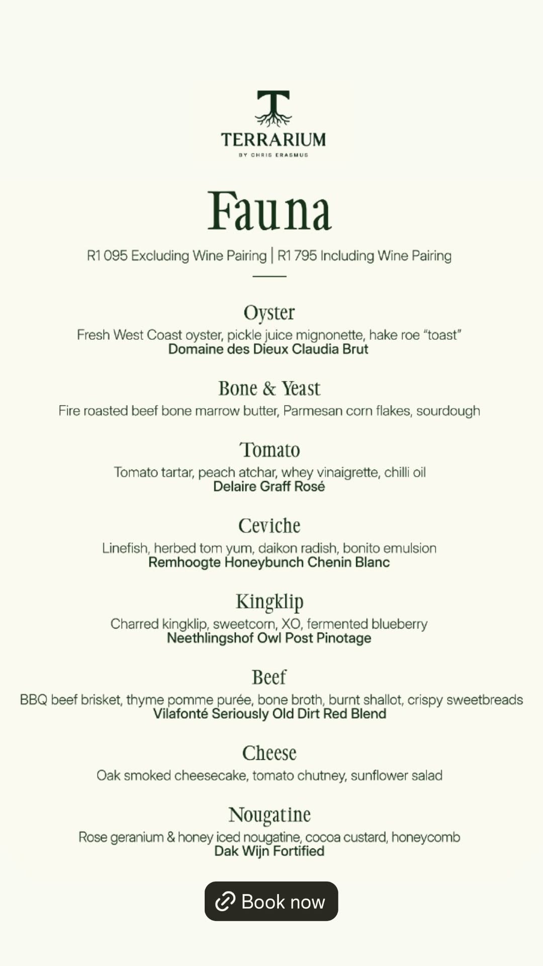 Terrarium by Chris Erasmus invites you to indulge in their wonderful culinary experiences, Flora and Fauna, designed to captivate your palate and celebrate the art of fine dining.