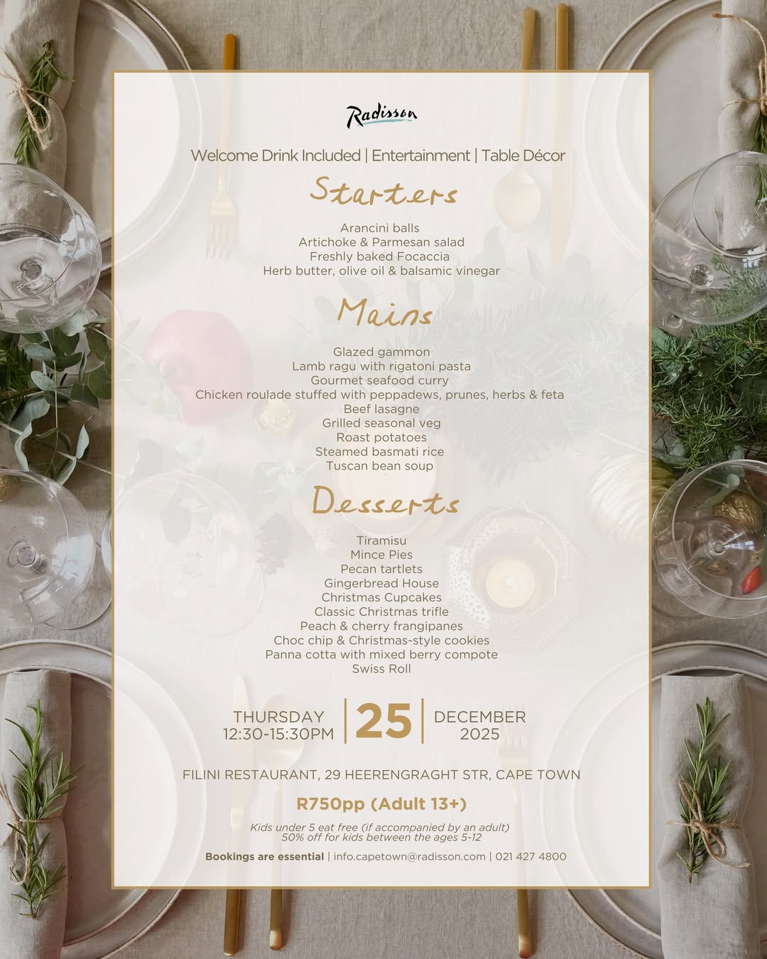 If you’re dreaming of a stress-free Christmas lunch packed with all your festive favourites (without a single dirty dish in sight), Filini Restaurant at the Radisson Hotel Cape Town Foreshore has just the ticket.