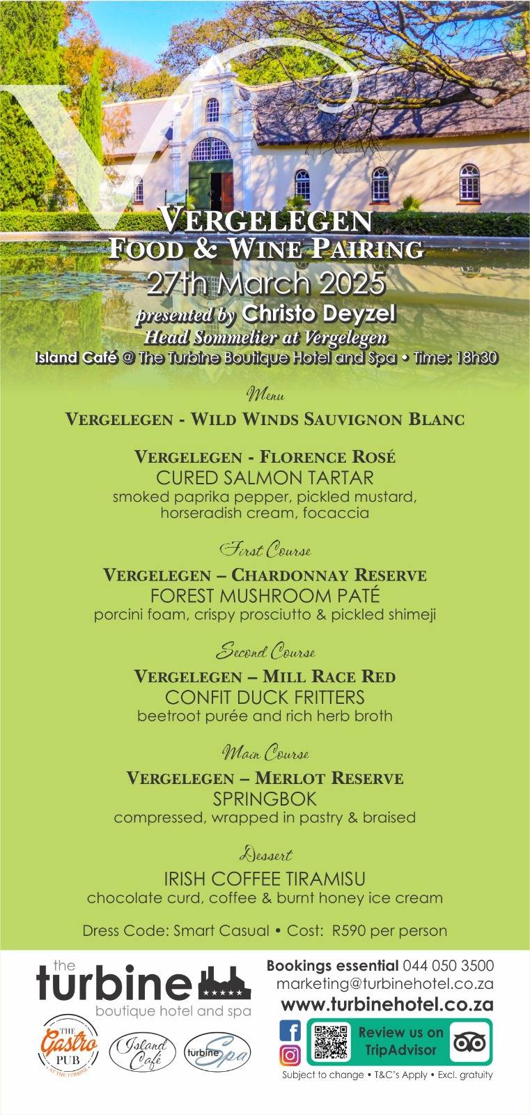 Bookings are essential, so secure your spot by contacting marketing@turbinehotel.co.za or calling 044 050 3500. Don’t miss out on a night of elegance, flavor, and perfectly paired wines!