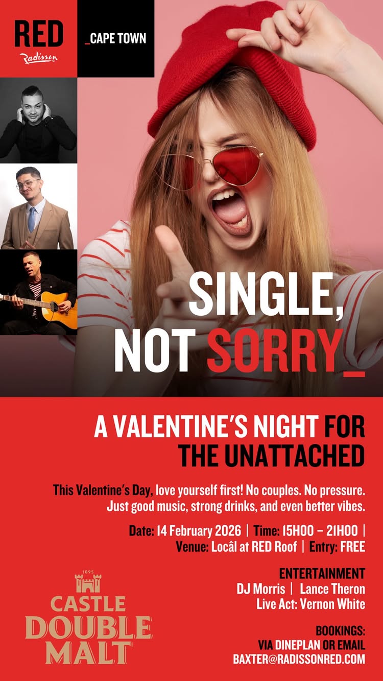 Set against the city skyline and known for its bold personality, Radisson RED Cape Town offers the perfect backdrop for a celebration that breaks the mould. Single, Not Sorry is less about what Valentine’s Day is supposed to be and more about what it can be. Fun, inclusive, and refreshingly pressure-free. Bookings can be made via Dineplan or by emailing baxter@radissonred.com.