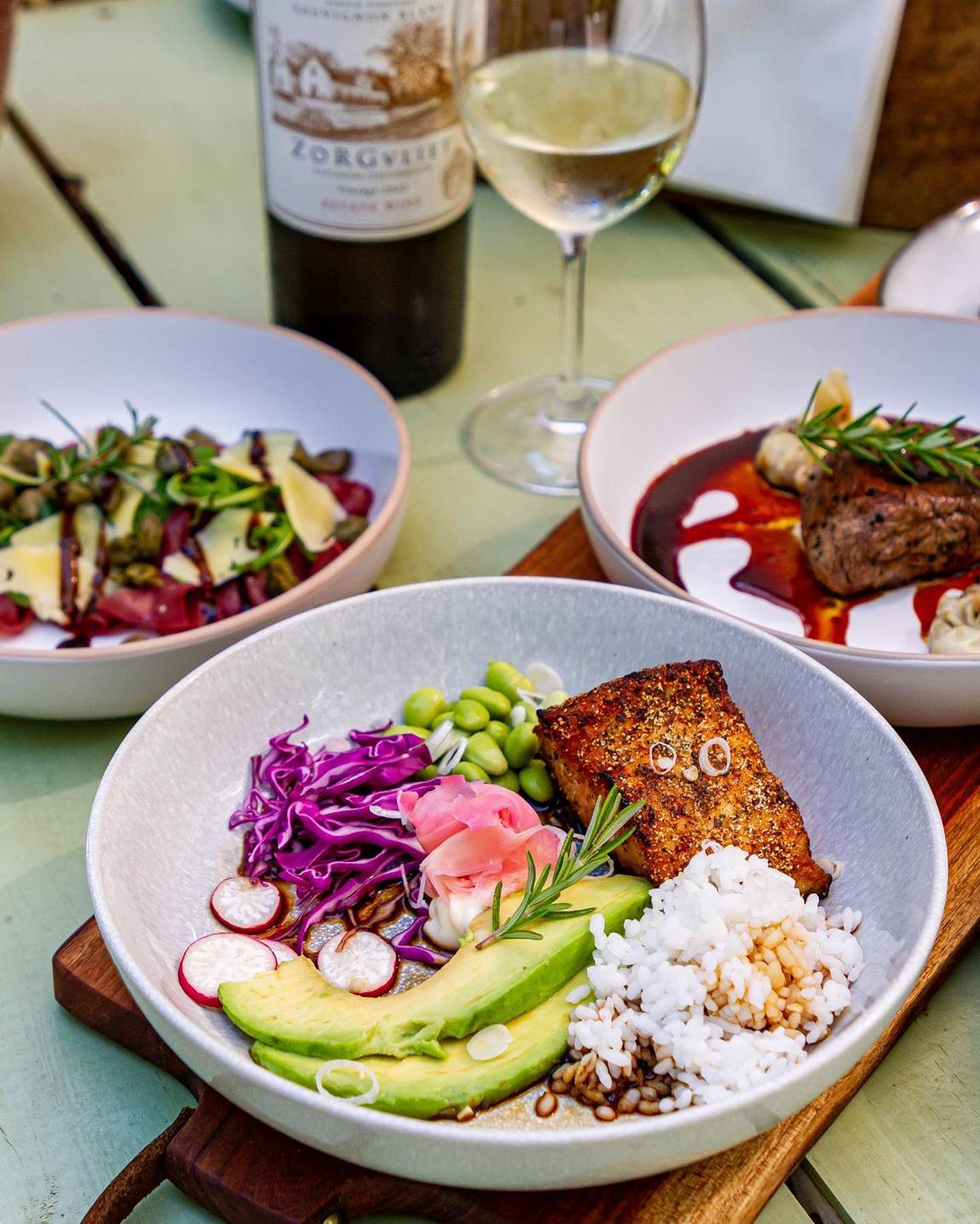 - If seafood is more your thing, the Salmon Poke Bowl is a fantastic choice. It includes sushi rice, edamame beans, and fresh radish, topped with Norwegian salmon and a zingy ginger and soy sauce. Pair it with the Zorgvliet Cabernet Franc Rosé for a perfect match.