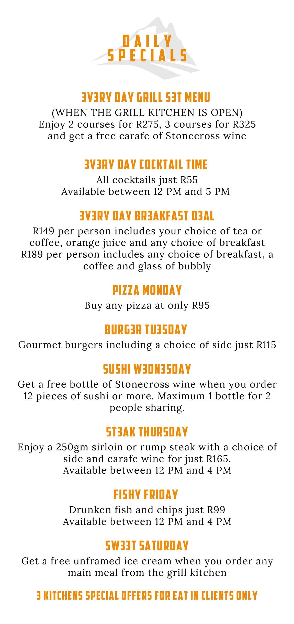 - Start your week with Pizza Monday, where any pizza is a steal at only R95.