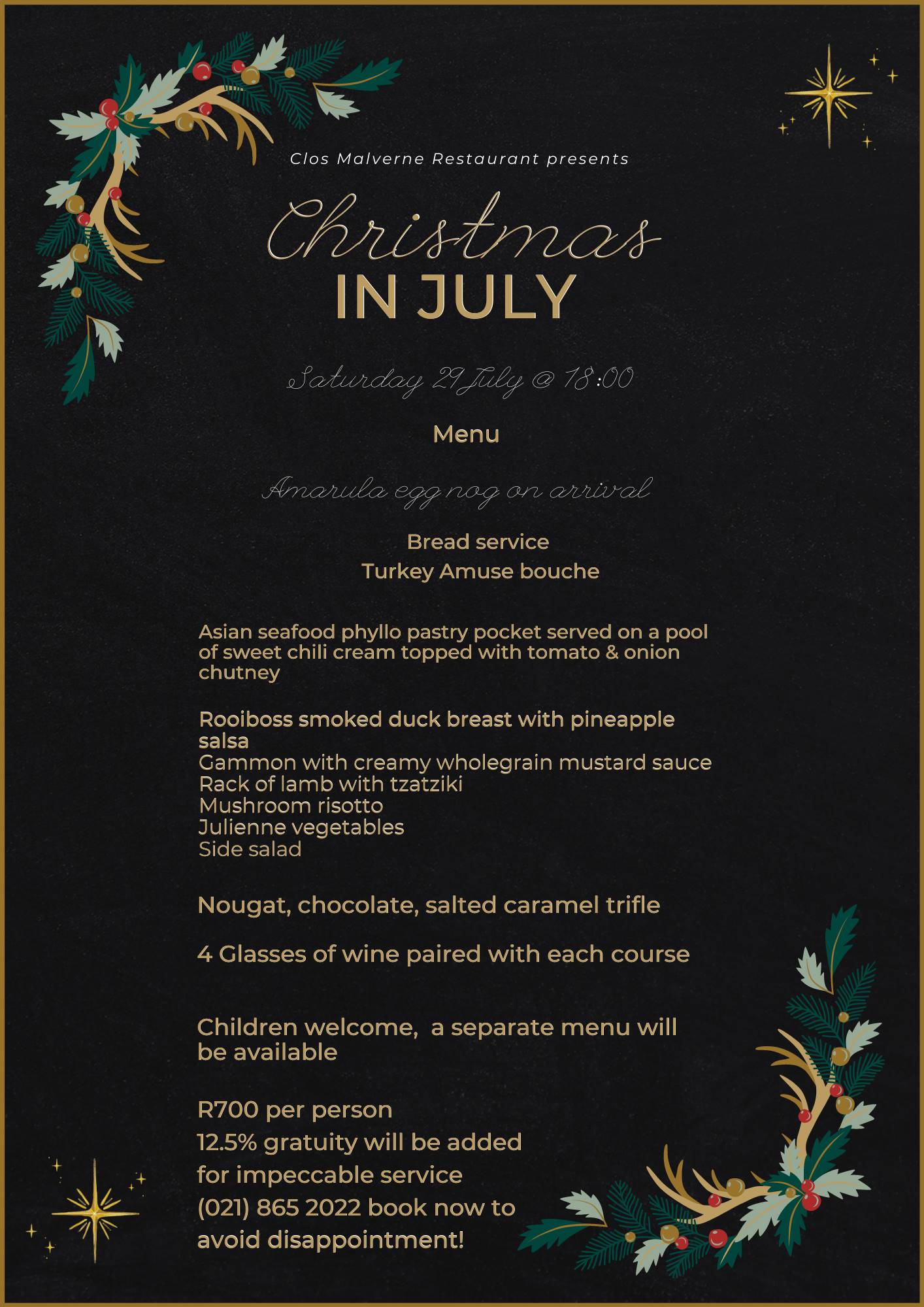 If you thought you had to wait until December for a jolly, festive feast, think again! Clos Malverne Restaurant is excited to present their much-anticipated “Christmas in July” event on Saturday, 29th of July at 18:00.