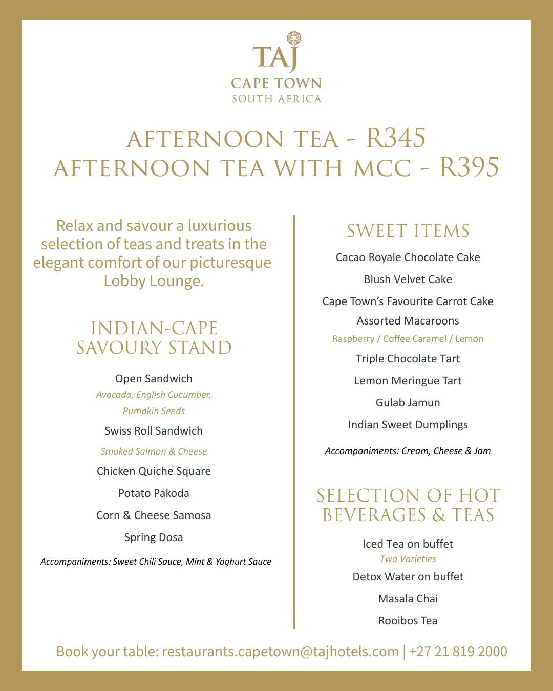 - Of course, no tea is complete without a little sugar rush—and Taj delivers in style. On the sweet side of things, guests can savour mini masterpieces like gulab jamun, triple chocolate tart, Cape Town’s favourite carrot cake, and blush velvet cake, not to mention an array of colourful macarons and lemon meringue tarts.