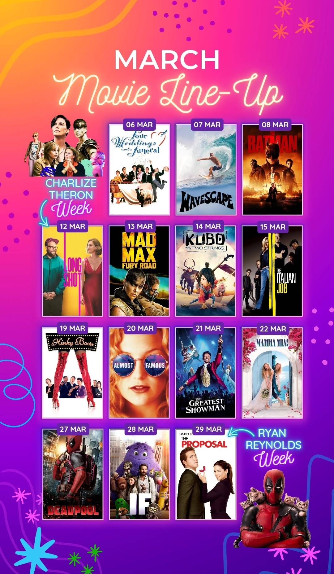 Closing out the month in the best way possible is Ryan Reynolds Week! Whether playing a wise-cracking antihero, a charming rom-com lead, or an animated buddy, Reynolds is set to steal hearts and crack jokes with:
