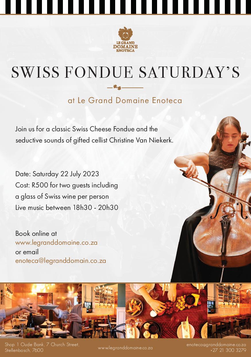 This culinary extravaganza promises an evening filled with delectable Swiss cheese fondue and the enchanting melodies of the talented cellist, Christine Van Niekerk.