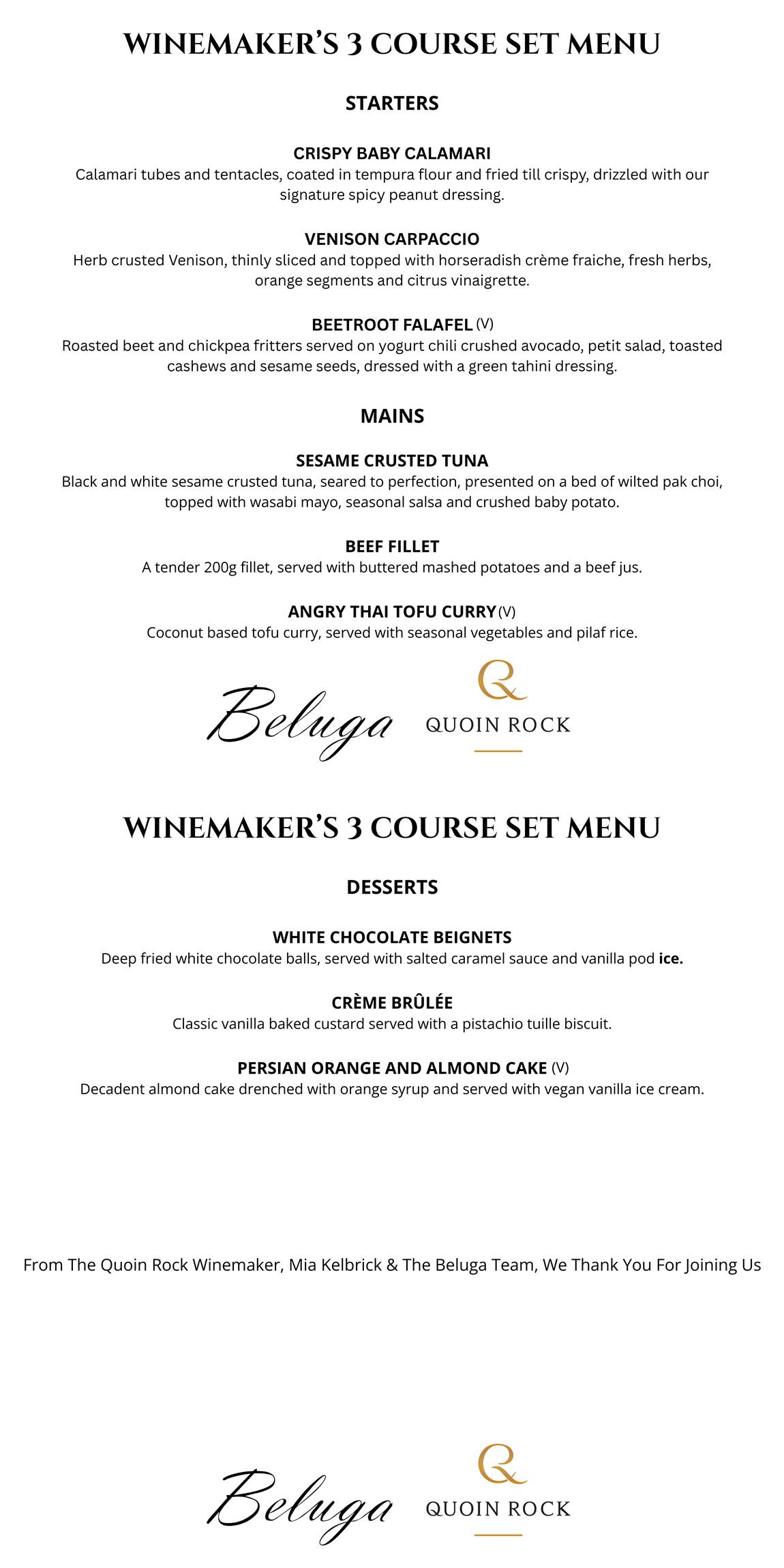 For one unforgettable evening, Beluga invites you to take a seat at the table for an intimate 3-course dining experience — each course paired with a carefully selected Quoin Rock wine.