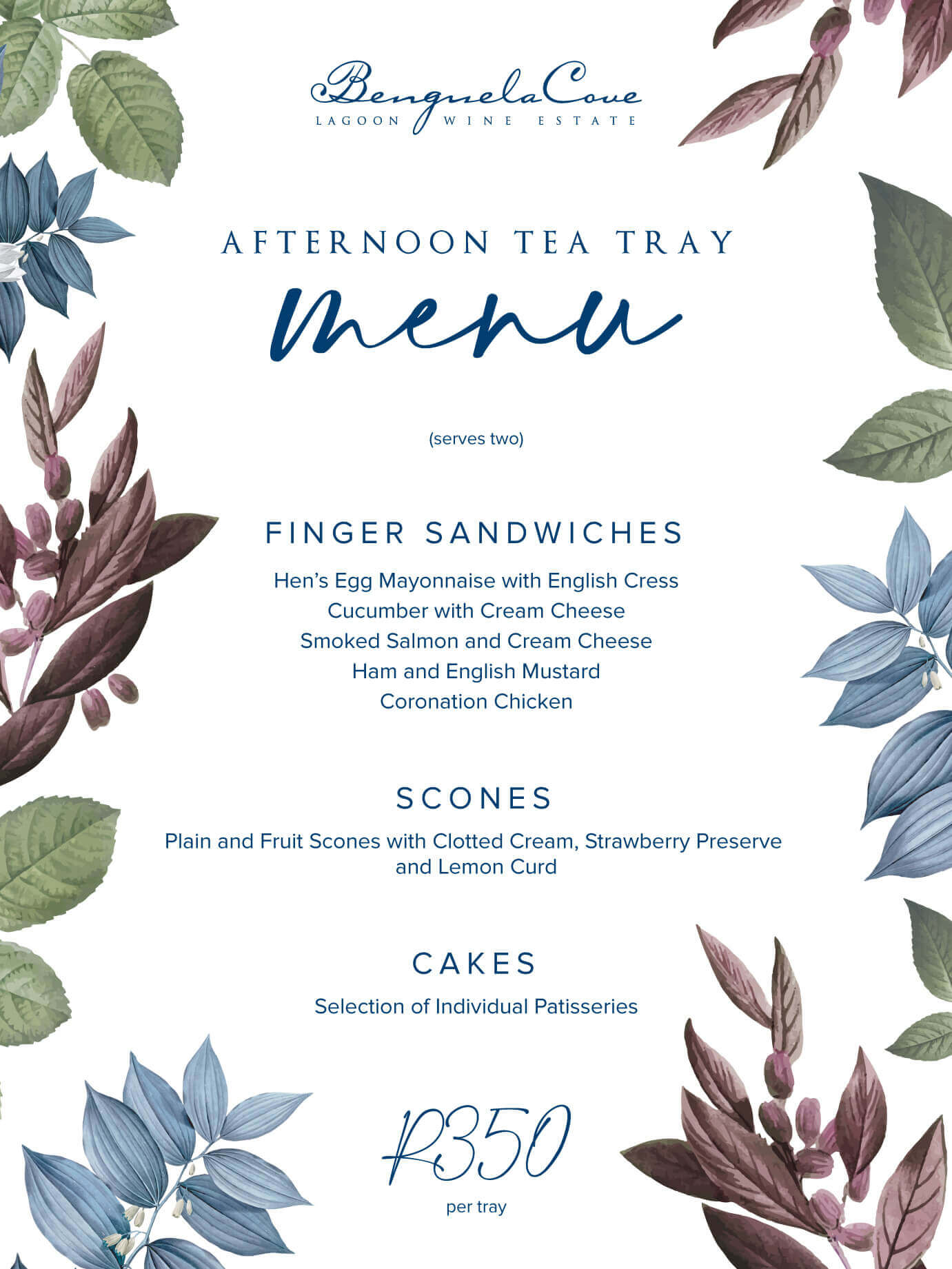 Relax and enjoy a blissful afternoon together over an assortment of delicate finger sandwiches, freshly-baked cakes, pastries and scones. You can expect an excellent range of teas selected from the Rare Tea Co – and choose a glass of our extra special Benguela Cove Cuvée58 Méthode Cap Classique to add that extra sparkle.