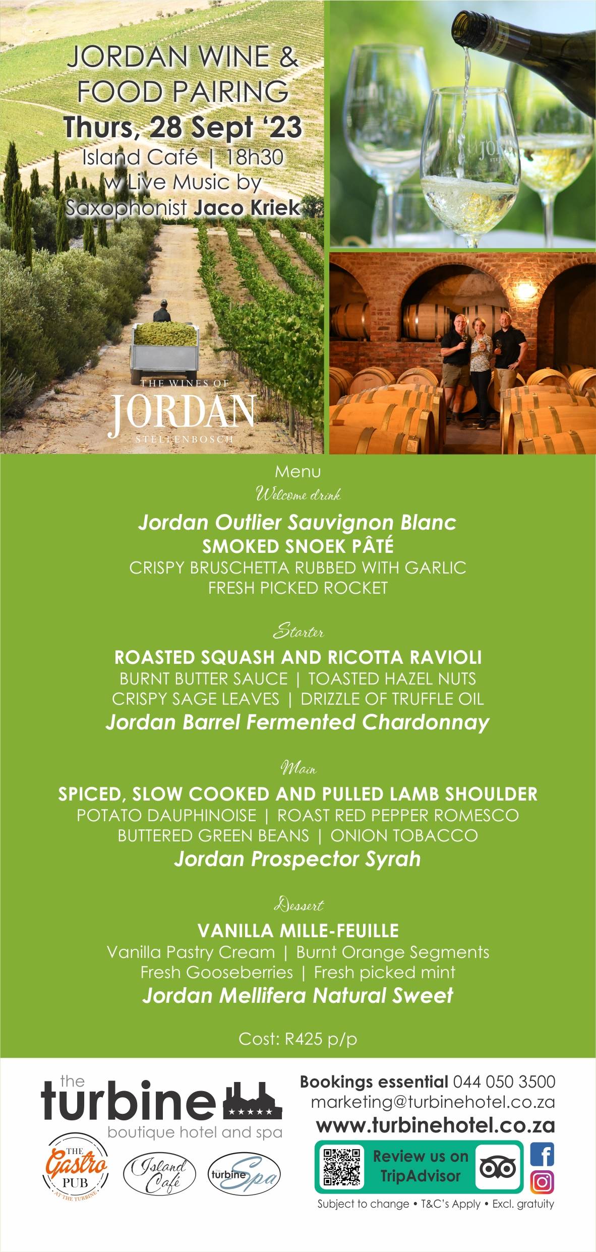 - To start, guests will be greeted with a welcome drink, the crisp and refreshing Jordan Outlier Sauvignon Blanc, paired with smoked snoek pate and crispy bruschetta, generously rubbed with garlic and adorned with fresh-picked rocket.