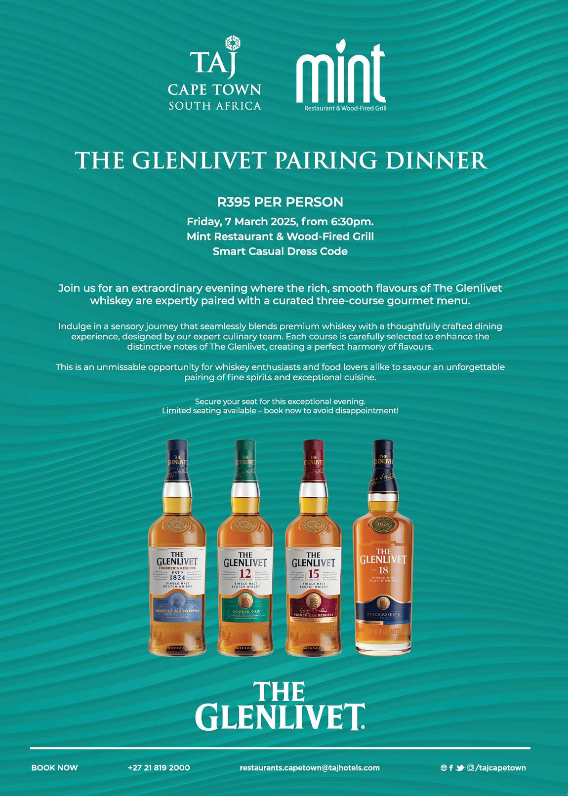 On Friday, 7 March, Taj Cape Town invites you to an exclusive Glenlivet Pairing Dinner at Mint Restaurant & Wood-Fired Grill, where exceptional cuisine meets the finest single malts.