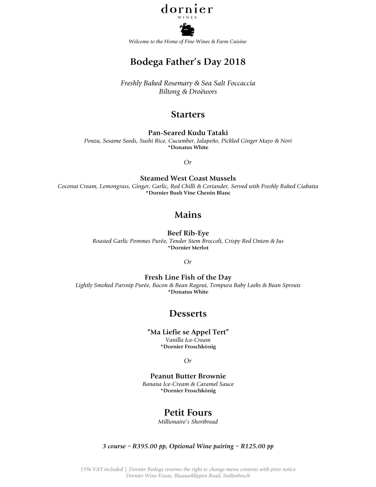 3 course – R395.00 per person, Optional Wine Pairing – R125.00 pp