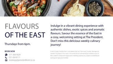 Spice up your dining experience! The President Hotel in Cape Town invites you to embark on a culinary journey with their “Flavours of the East” dining experience. [full menu] Every Thursday from 6 pm to 10 pm, guests can indulge in authentic Eastern dishes, infused with exotic spices and aromatic flavors, set in a cozy […] More