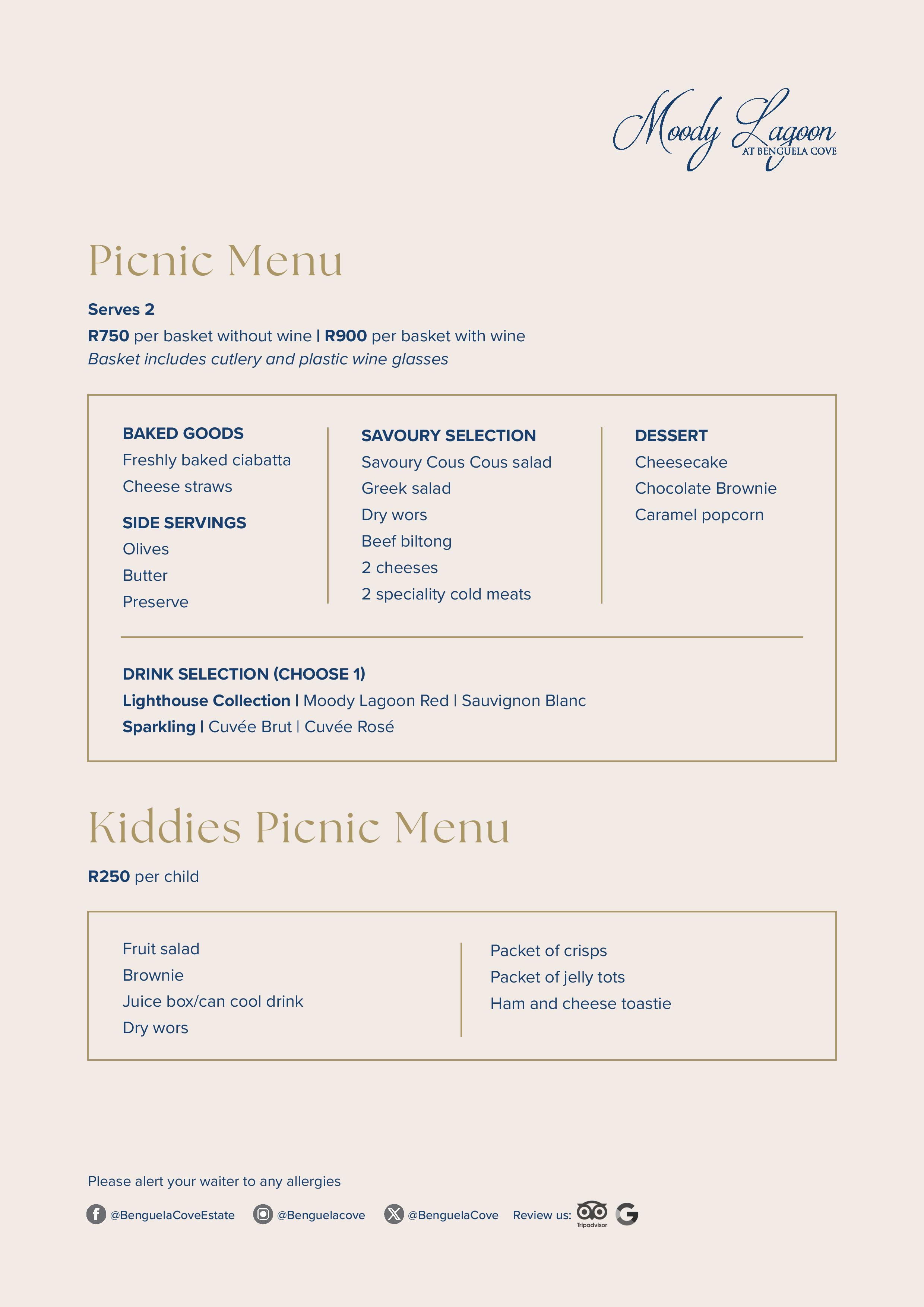 - The wine? You get to choose one from their lineup of favourites — Moody Lagoon Red, Sauvignon Blanc, or something with bubbles like Cuvée Brut or Cuvée Rosé. Plastic wine glasses are included, because Benguela Cove knows you didn’t come here to sip from a paper cup.