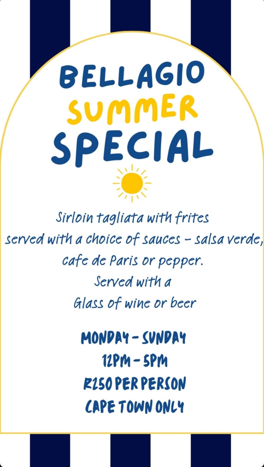 - Every day of the week, from 12pm to 5pm, Bellagio is serving up a plate that feels like a vacation in itself: sirloin tagliata with crispy frites, paired with your choice of sauce — salsa verde if you’re feeling fresh, café de Paris if you enjoy the classics, or pepper sauce for the bold-at-heart. And because no good summer meal should go unaccompanied, your plate arrives with a glass of wine or beer, all for just R250 per person.