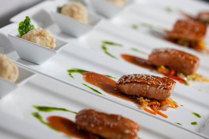 Char Siu and sesame glazed salmon with tempura sticky rice