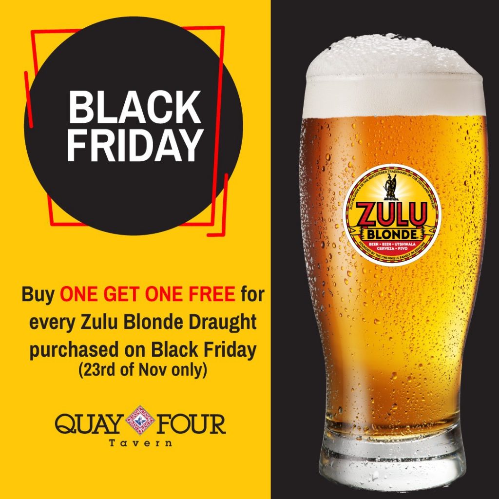 Enjoy this buy one get one free special, for every Zulu Blonde Draught purchased on Black Friday you get a second free! Join them on Friday, 23 November for a refreshing beer for less!