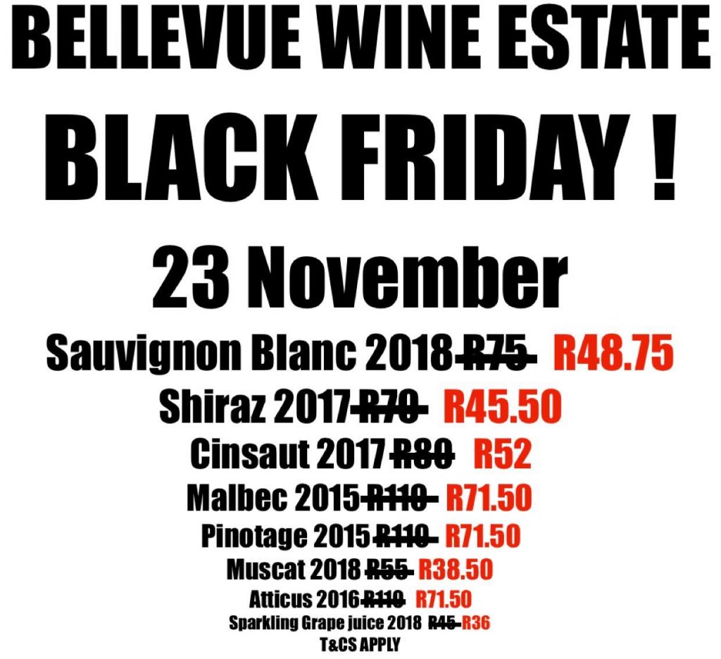 It’s time to stock up on your favourite Bellevue wines with this unbelievable special that sees a number of their fantastic wines being sold at discounted prices. Bellevue has been working hard to bring you the BEST deals for this coming Friday, so don’t miss out, visit them at their estate or hop online to order.
