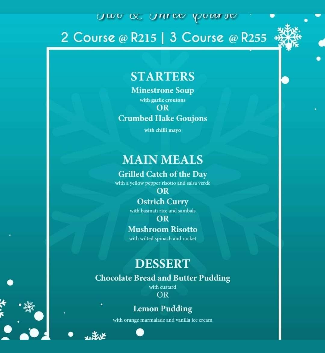 - As the journey continues, guests are presented with an impressive selection of main courses. The Grilled Catch of the Day takes center stage, showcasing the finest locally sourced seafood, expertly prepared to perfection. For those seeking a taste of South African cuisine, the Ostrich Curry offers a fusion of fragrant spices and tender meat that will transport diners to new heights of culinary delight. Vegetarian patrons are not forgotten, as the Mushroom Risotto presents a harmonious blend of earthy mushrooms and creamy Arborio rice, creating a truly indulgent experience.