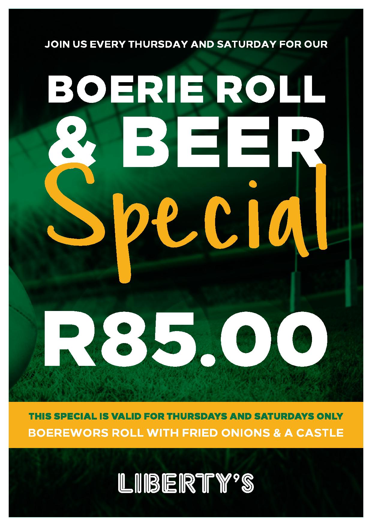 Every Thursday and Saturday, Liberty’s Restaurant invites you to savor their Boerie Roll & Beer Special for just R85.