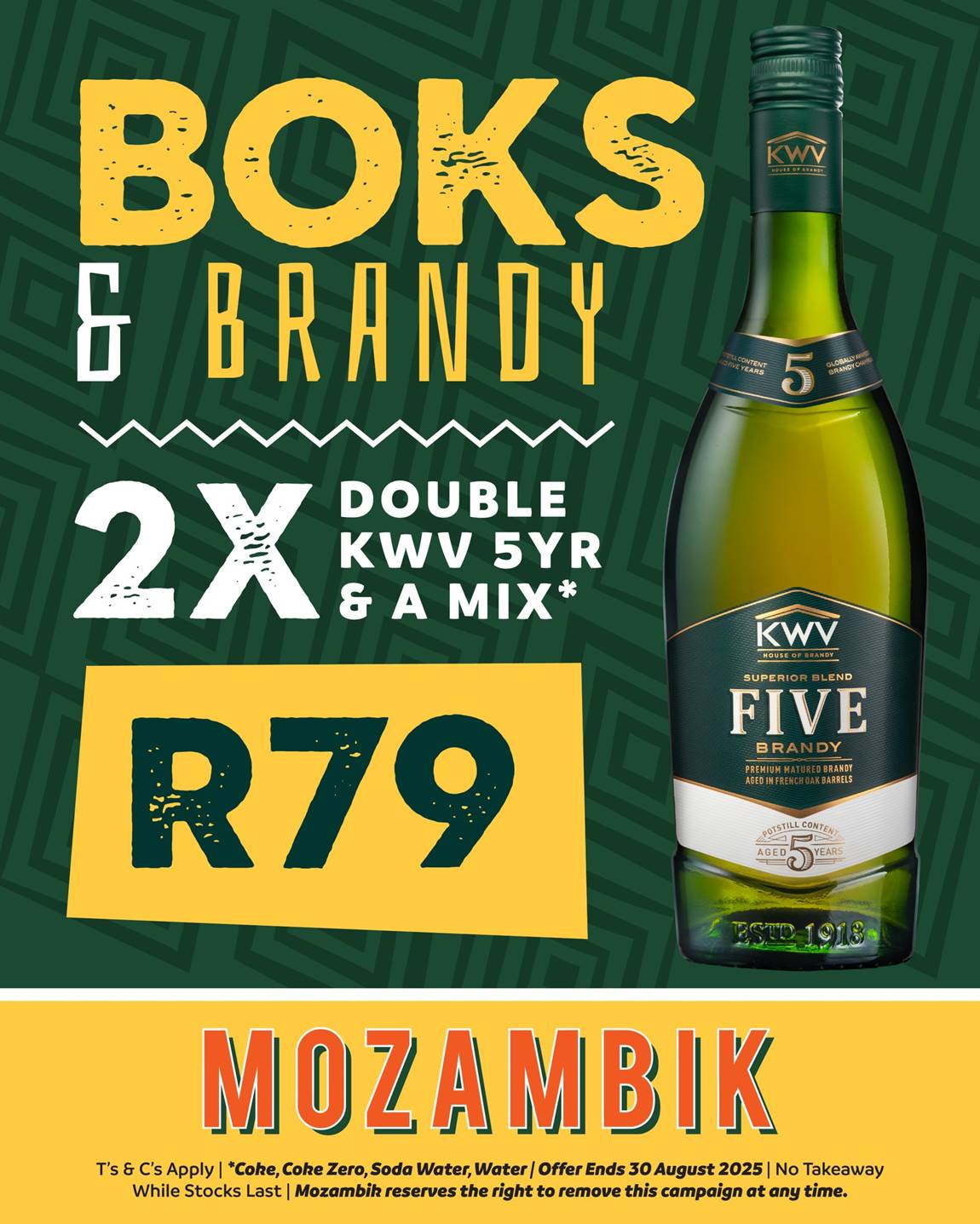 Winter weekends in South Africa are built for two things: Springbok rugby and a good brandy in hand. Luckily, Mozambik’s serving both — and at a price that won’t make you flinch.