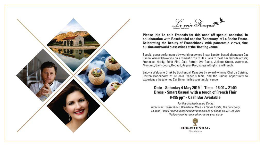 Please join Le Coin Francais for this once off special occasion, in collaboration with Boschendal and the ‘Sanctuary’ of La Roche Estate.