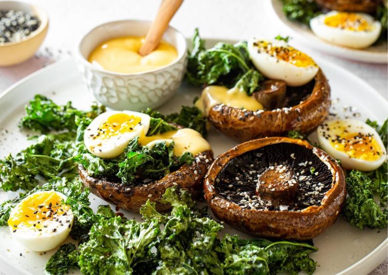 Breakfast Portabellos with Soft Boiled Eggs, Crispy Kale & Hollandaise Recipe