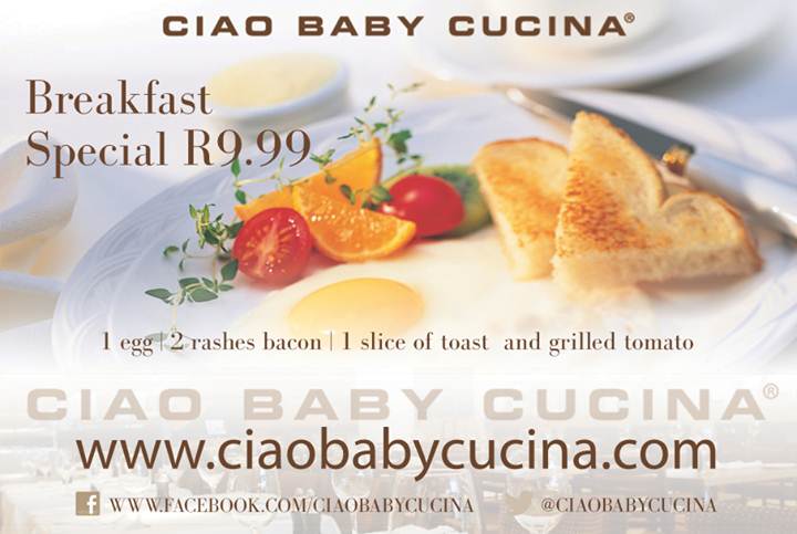 If you’re shopping in Tygervalley Shopping Mall, come and experience the terrific R9.99 breakfast at Ciao Baby Cucina. It includes 1 egg, 2 rashes of bacon, 1 slice of toast and a grilled tomato.
