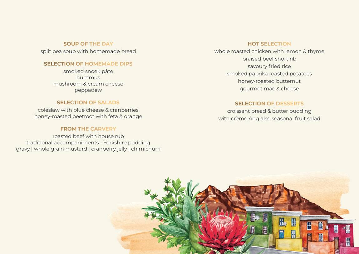 - Think split pea soup with homemade bread to start, followed by a dreamy selection of dips like smoked snoek pâté and peppadew cream cheese. Load up your plate with fresh salads—hello, blue cheese & cranberry coleslaw—and then dive into the carvery, featuring juicy roasted beef, Yorkshire pudding, and all the saucy sides (gravy, chimichurri, even cranberry jelly).