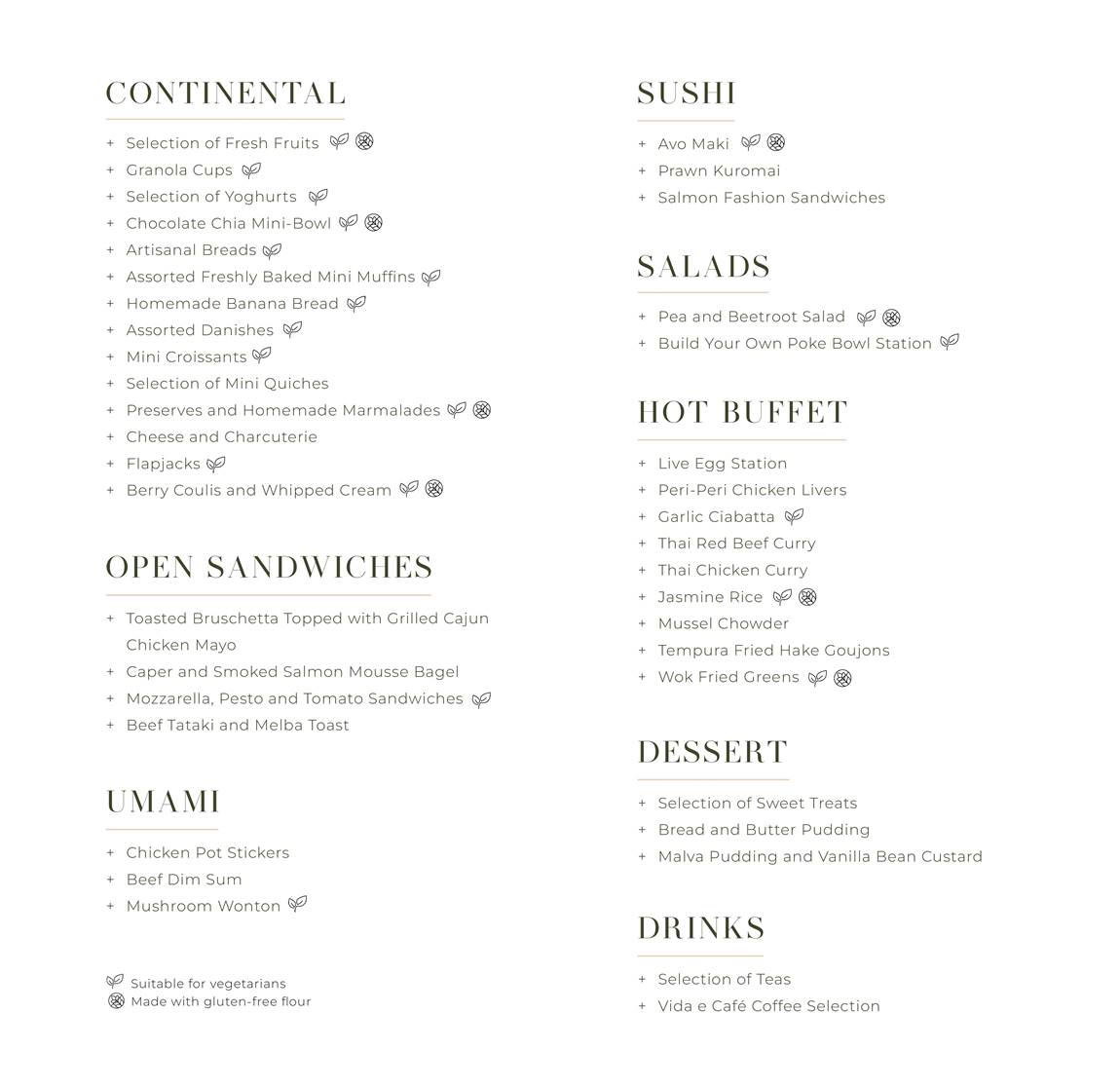 - The menu? Think luxury hotel brunch meets international flair. There’s a little something from every corner of the globe and enough variety to please both your avo-toast-loving cousin and your curry-for-breakfast dad. Expect things like fresh pastries, sushi, open sandwiches, warm umami bites, and a hot buffet packed with flavour (the Thai curries are no joke). And let’s not forget the desserts—because every mom deserves a little Malva pudding and vanilla bean custard to round out her royal treatment.