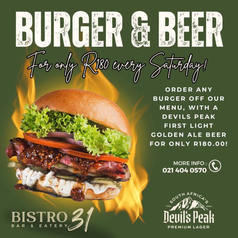 With its relaxed atmosphere and warm hospitality, Bistro 31 offers the perfect spot to unwind and indulge in good food and great company. Don’t miss out on this unbeatable Burger & Beer special. For more information, call 021 404 0570 and head to Bistro 31 for a Saturday feast to remember.