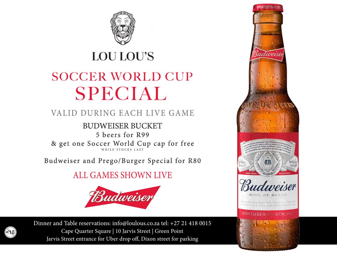 During the World Cup, Lou Lou’s is offering a fantastic burger special and beer promotion. A Budweiser Bucket of 5 beers are available for only R99 with a free Soccer World Cup cap included for free. There’s also a Budweiser and Burger special for only R80 available during all games.